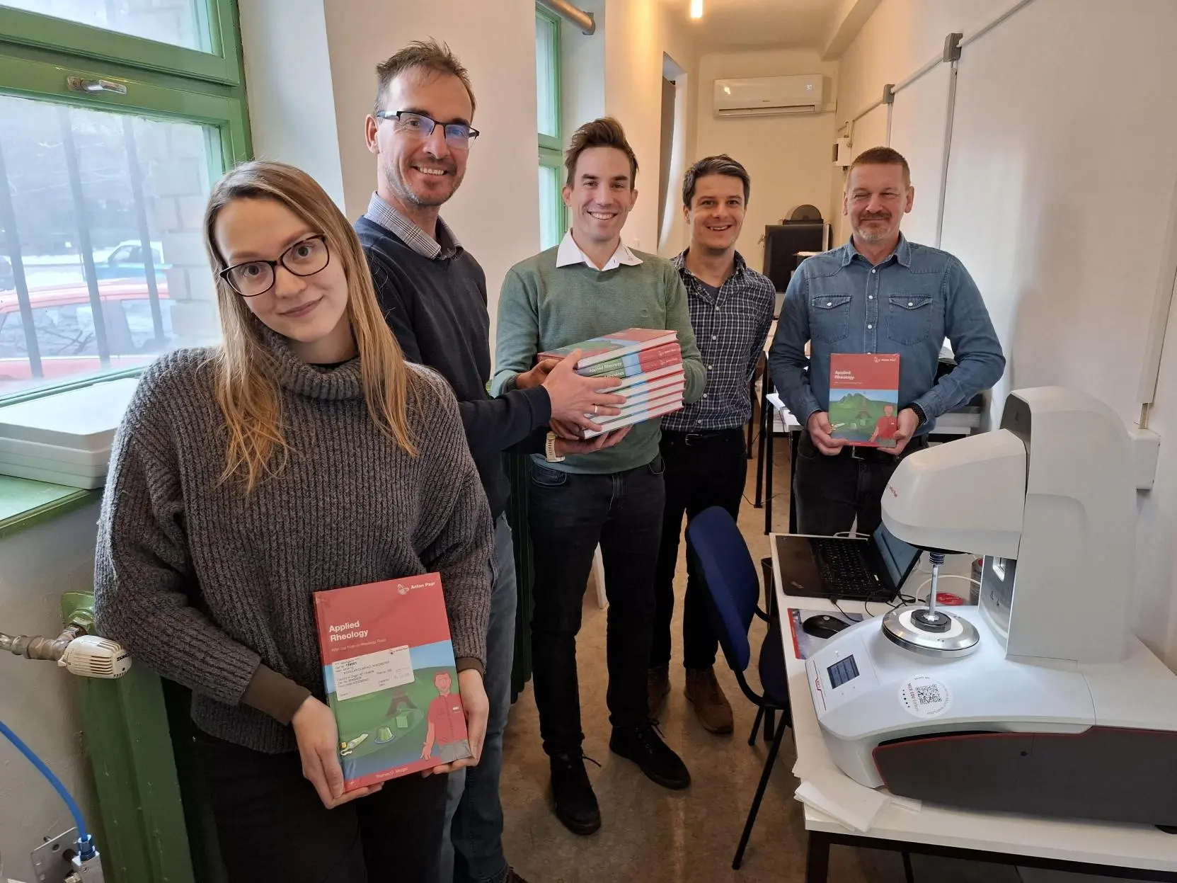 A new instrument, an Anton Paar viscometer, has been added to the Nemnewton Flows Research Group ‘s range of instruments. The viscometer will be used both as a teaching tool and to accelerate research experiments by performing control measurements. During the laboratory commissioning, we also received copies of the book Applied Rheology by Thomas G. Mezger, which will be used by our students in the course Mechanics of Non-Newtonian Fluids. We hope that this is the beginning of a long-term relationship between our research group and Anton Paar Hungary Kft.